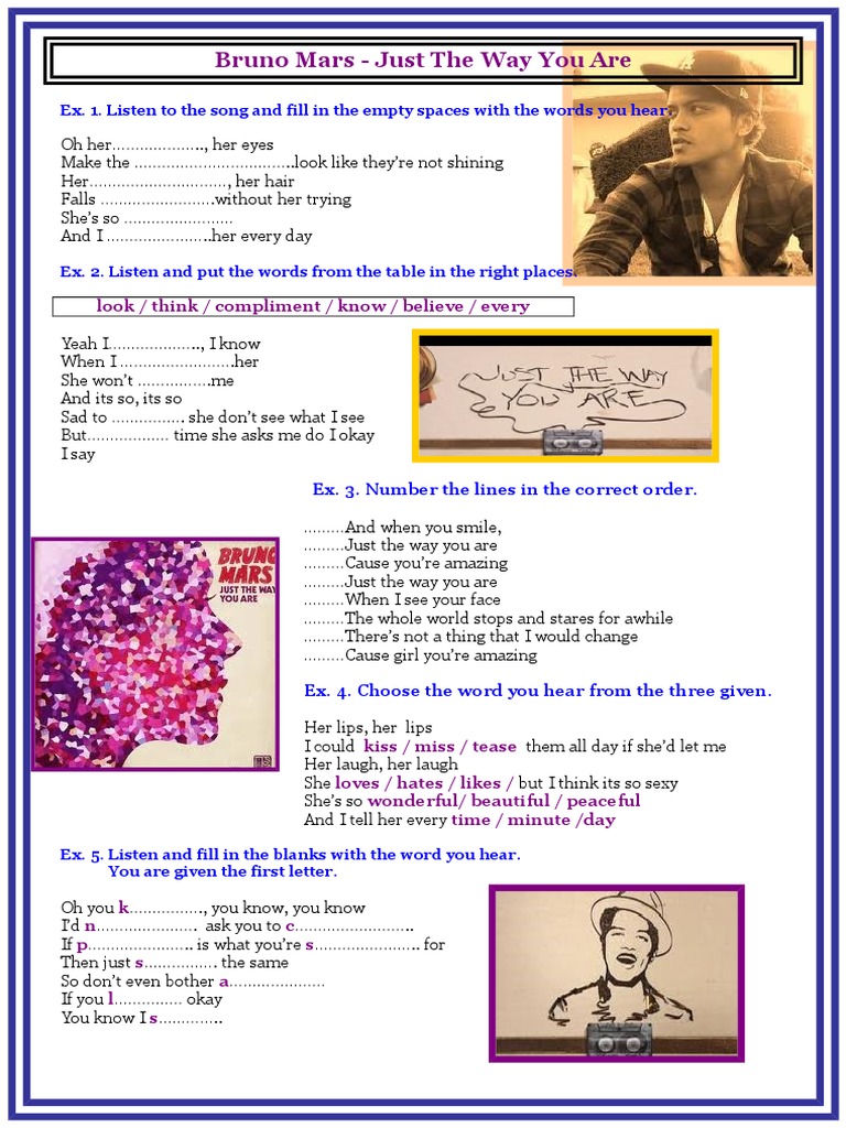 Students learn some important vocabulary terms and phrases from the song lyrics. Just the way you are by bruno mars. Just the way you are capo 5 intro c am f c verse c oh, her eyes, her eyes make the stars look like they're not shining am her hair, her hair falls perfectly without her trying f c she's so beautiful, and i tell her every day c yeah, i know, i know when i compliment her she won't believe me am and it's so, it's so sad to think she don't see what i see f c but every. Khari cain / khalil walton / philip lawrence / bruno mars / ari levine. In the uk, 'just the way you are' topped the official charts company, becoming bruno's second number 1 single and the third biggest seller of the year.
