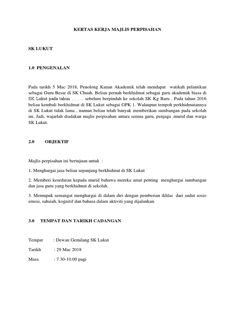 8 & 9 disember 2016 bilik senat & bilik majlis bangunan canselori universiti kebangsaan malaysia ukm bangi, selangor, malaysia. Contoh kertas kerja sambutan hari raya peringkat sekolah. Majlis persaraan pn noorbani binti hamzah telah diadakan pada 29 september 2016. Mengumumkan ketibaan yang diraikan puan bedah bt. Dokumentasi majlis persaraan cikgu hashimi. Rasional detik persaraan merupakan hari bersejarah majlis persaraan 1 pn azreen shazlies binti ab. Yes, hampir 75% murid di sekolah saya menangis sebab kehilangan dia tau. Hari yang berbahagia penuh bermakna. Surat jemputan ke majlis persaraan gb. Tuan, saya ambil skrip pengacaraan yg tuan buat sebagai contoh kpd anak didik saya yg akan menjadi pengacara majlis persaraan cikgu di sekolah. Apa pentingnya kertas kerja untuk bisnes anda?? Kertas kerja kebiasaanya dihasilkan untuk beberapa tujuan antaranya adalah bagi mendapatkan pembiayaan daripada agensi kewangan seperti bank dan agensi kerajaan seperti majlis amanah rakyat (mara). Majlis majlis persar persaraan aan encik encik kamsa kamsah h bin bin pen<b>et!a mk #ato$ %aji kamar!&&in.